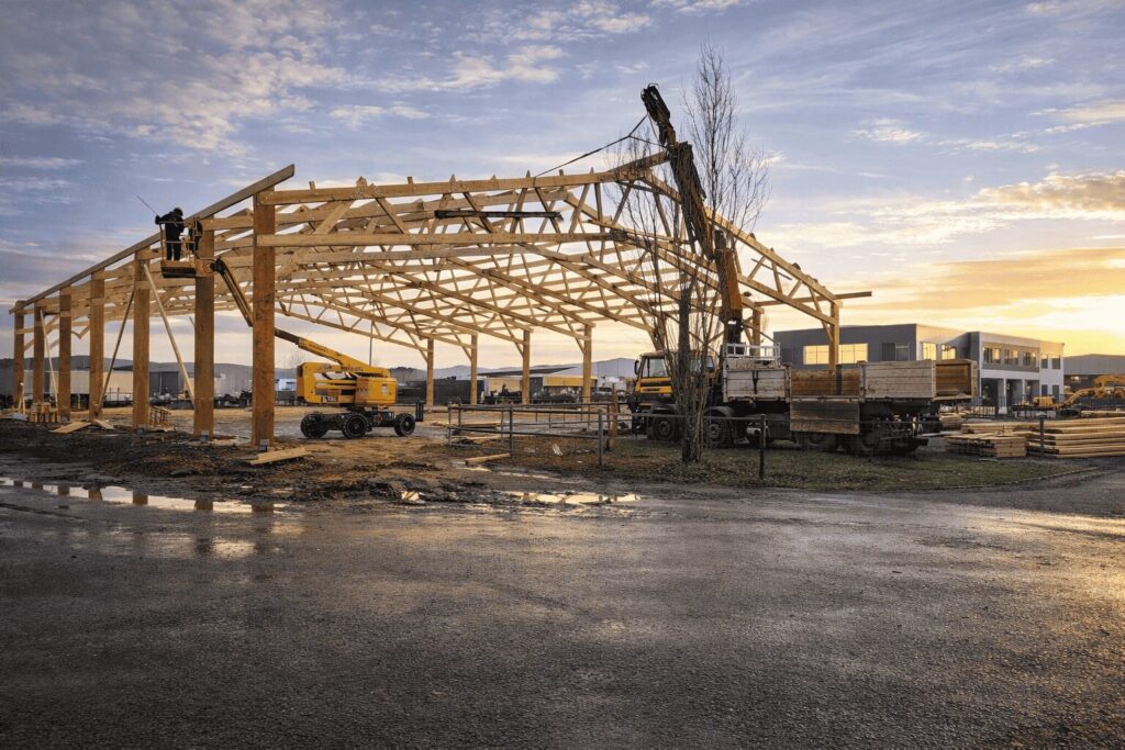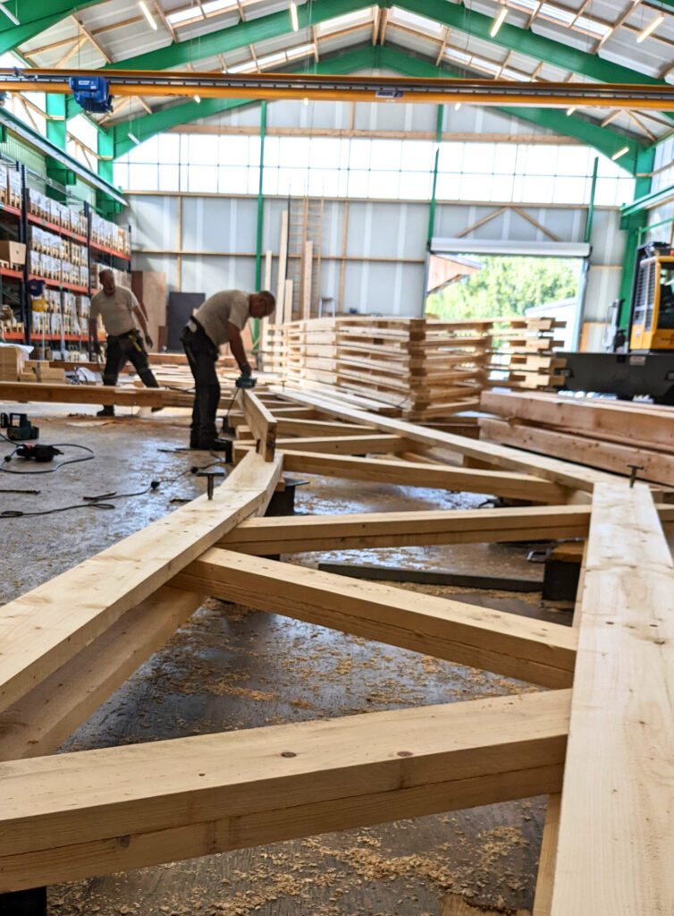 - Légèreté et portées importantes : leur structure triangulée réduit le poids tout en permettant de couvrir de grandes distances. Chez Le bâtiment bois, notre structure peuvent atteindre 37 m de large sans poteaux intermédiaires.